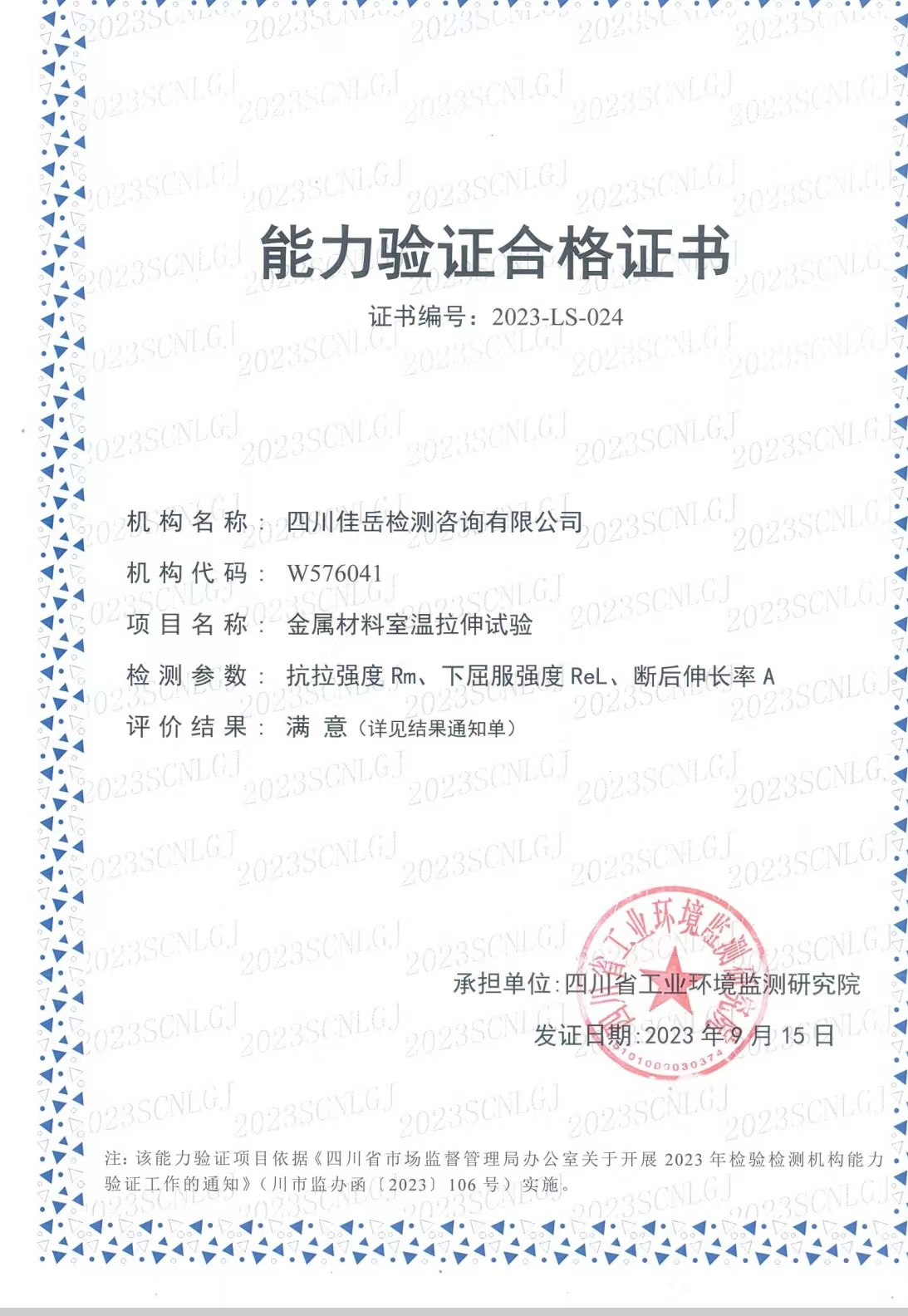 近日,四川省市場監(jiān)督管理局公布2023年能力驗證結(jié)果,雅安交建集團所屬四川佳岳檢測咨詢公司參加的保溫材料導(dǎo)熱系數(shù)檢測、室內(nèi)環(huán)境污染物甲醛檢測、水泥物理性能檢測、金屬材料室溫拉伸試驗等5項能力驗證,評價結(jié)果均為“滿意”。