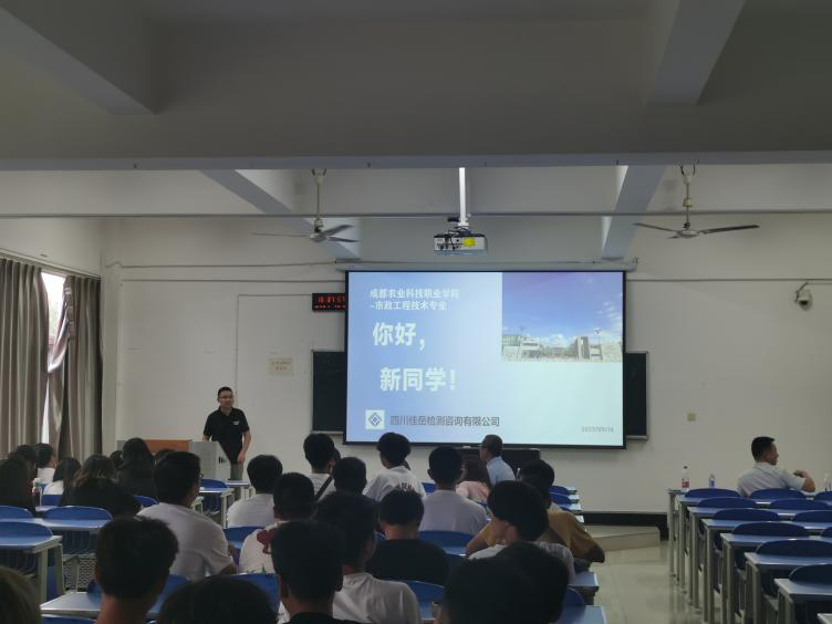 為深化校企合作,促進(jìn)合作內(nèi)容全面落實(shí)落地、交流融合,近日,交建集團(tuán)四川佳岳檢測公司應(yīng)邀參加成都農(nóng)業(yè)科技職業(yè)學(xué)院城鄉(xiāng)建設(shè)學(xué)院市政班入學(xué)專業(yè)教育分享會(huì)。佳岳公司檢測技術(shù)部工程師侯濤在會(huì)上作分享交流。