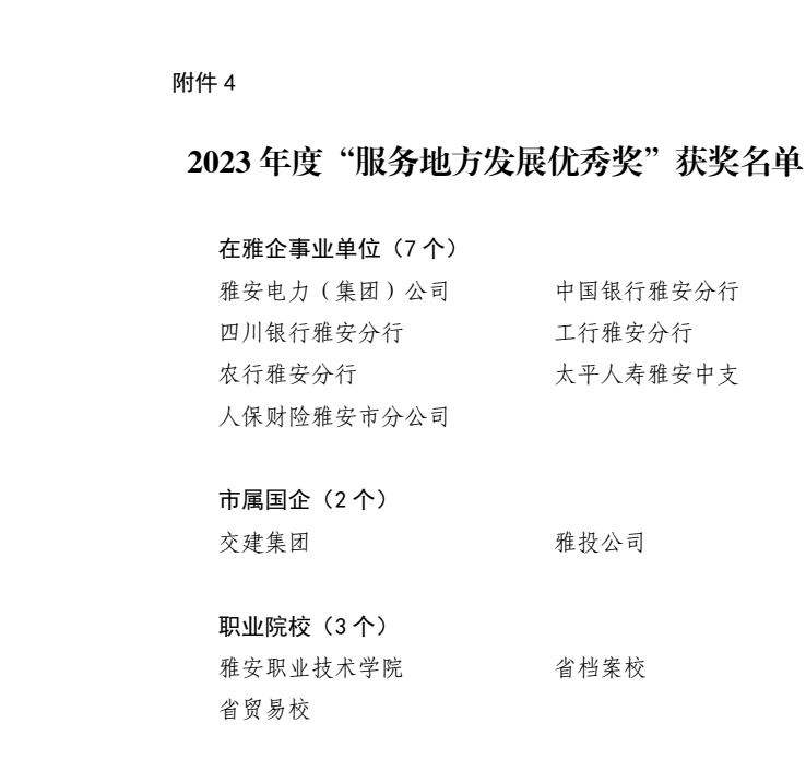 近日,中共雅安市委辦公室、雅安市人民政府辦公室印發(fā)《關(guān)于2023年度縣(區(qū))、市級部門和單列考評單位目標績效綜合考評結(jié)果的通報》,雅安交建集團獲得2023年度“服務(wù)地方發(fā)展優(yōu)秀獎”。