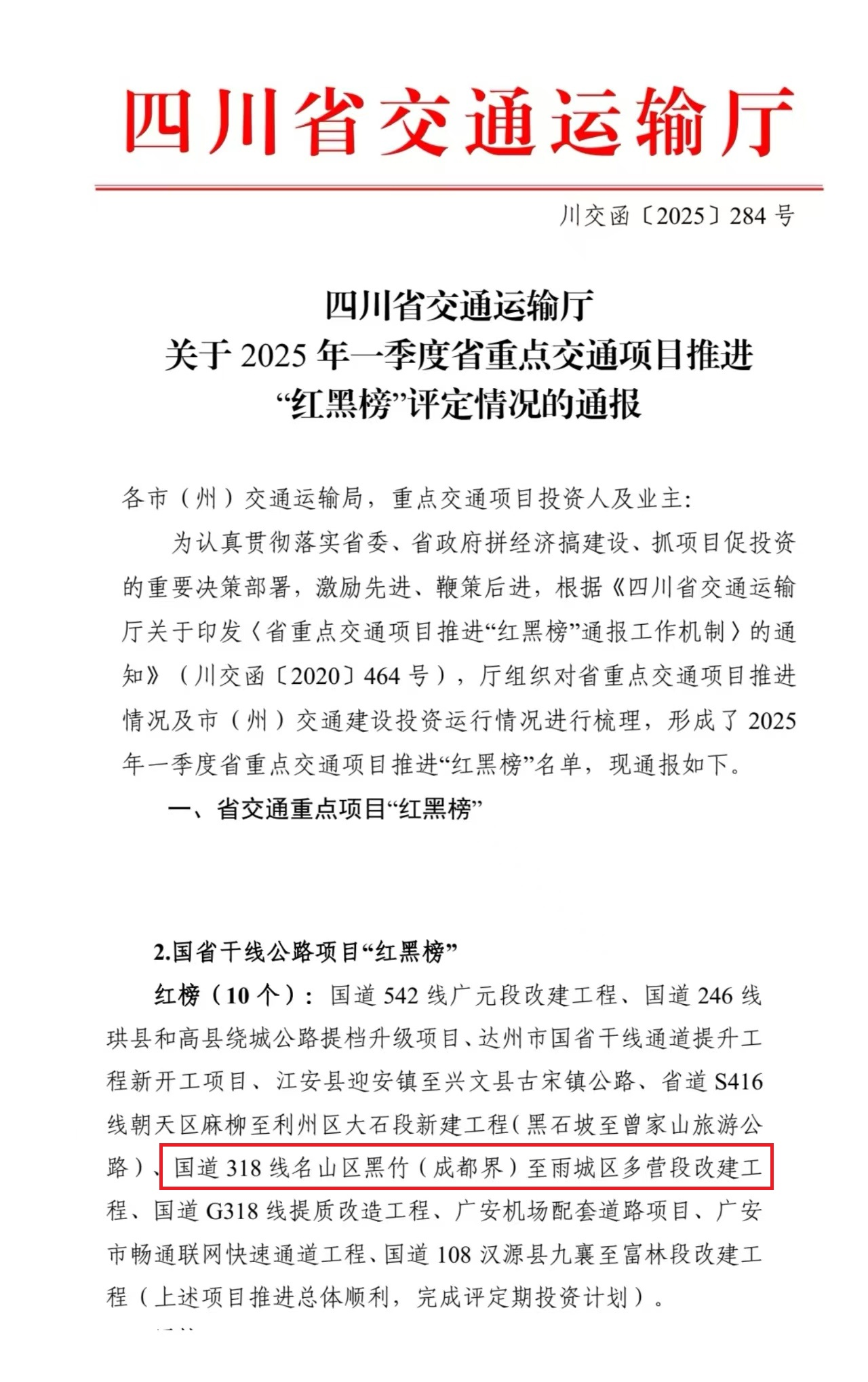 近日,四川省交通運(yùn)輸廳發(fā)布2025年一季度省重點(diǎn)交通項(xiàng)目推進(jìn)“紅黑榜”評(píng)選結(jié)果,由雅安交建集團(tuán)四川康藏路橋有限責(zé)任公司承建的國(guó)道318線(xiàn)名山區(qū)黑竹(成都界)至雨城區(qū)多營(yíng)段改建工程憑借超額完成投資計(jì)劃、關(guān)鍵節(jié)點(diǎn)取得突破等成效,成功入選國(guó)省干線(xiàn)公路項(xiàng)目“紅榜”。