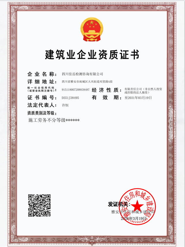 面對建筑檢測服務(wù)市場日趨激烈的競爭態(tài)勢和業(yè)務(wù)結(jié)構(gòu)單一的瓶頸,佳岳公司堅持以提質(zhì)升級為核心,主動破局、向內(nèi)挖潛,將資質(zhì)提升作為增強核心競爭力的關(guān)鍵突破口。3月19日,公司成功取得建筑業(yè)企業(yè)施工勞務(wù)資質(zhì)證書,標(biāo)志著公司具備承接各類施工勞務(wù)作業(yè)的法定資格,為拓展經(jīng)營領(lǐng)域、完善業(yè)務(wù)鏈條注入新動能。