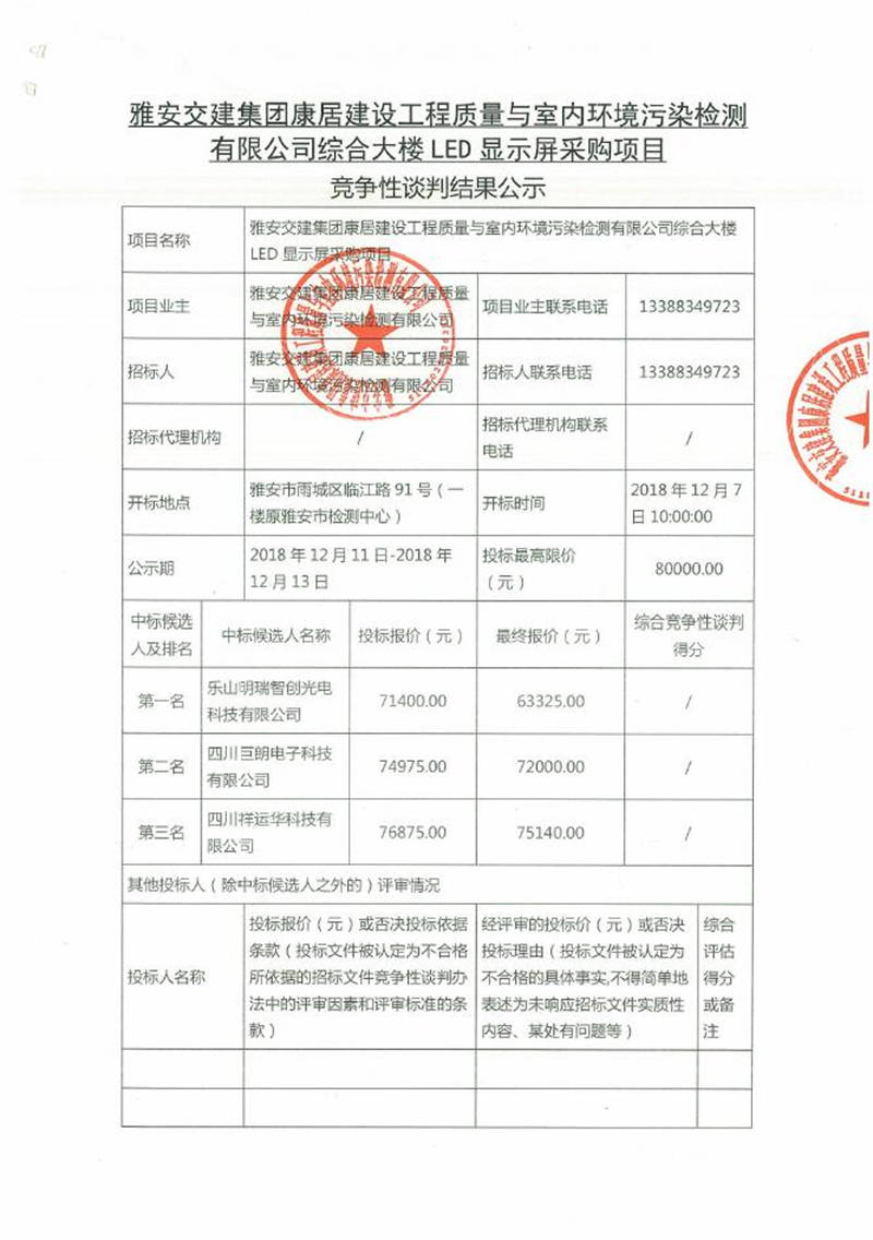 綜合大樓LED顯示屏采購項目競爭性談判結(jié)果公示