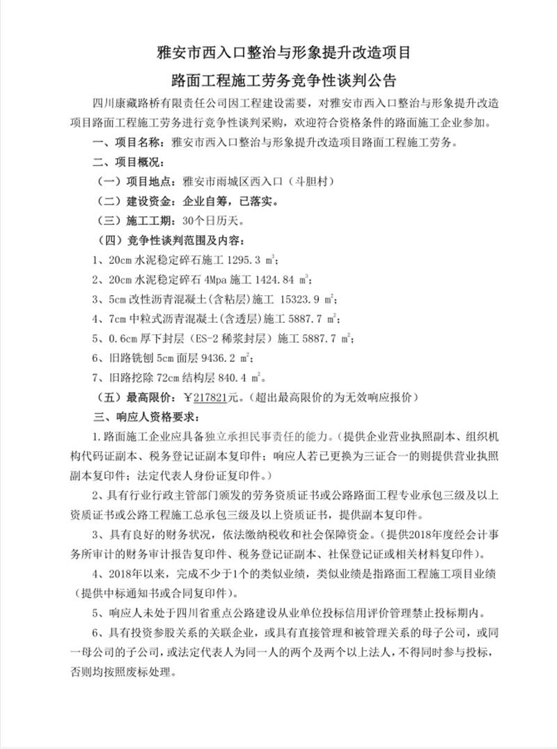 雅安市西入口整治與形象提升改造項(xiàng)目路面工程施工勞務(wù) 競爭性談判公告