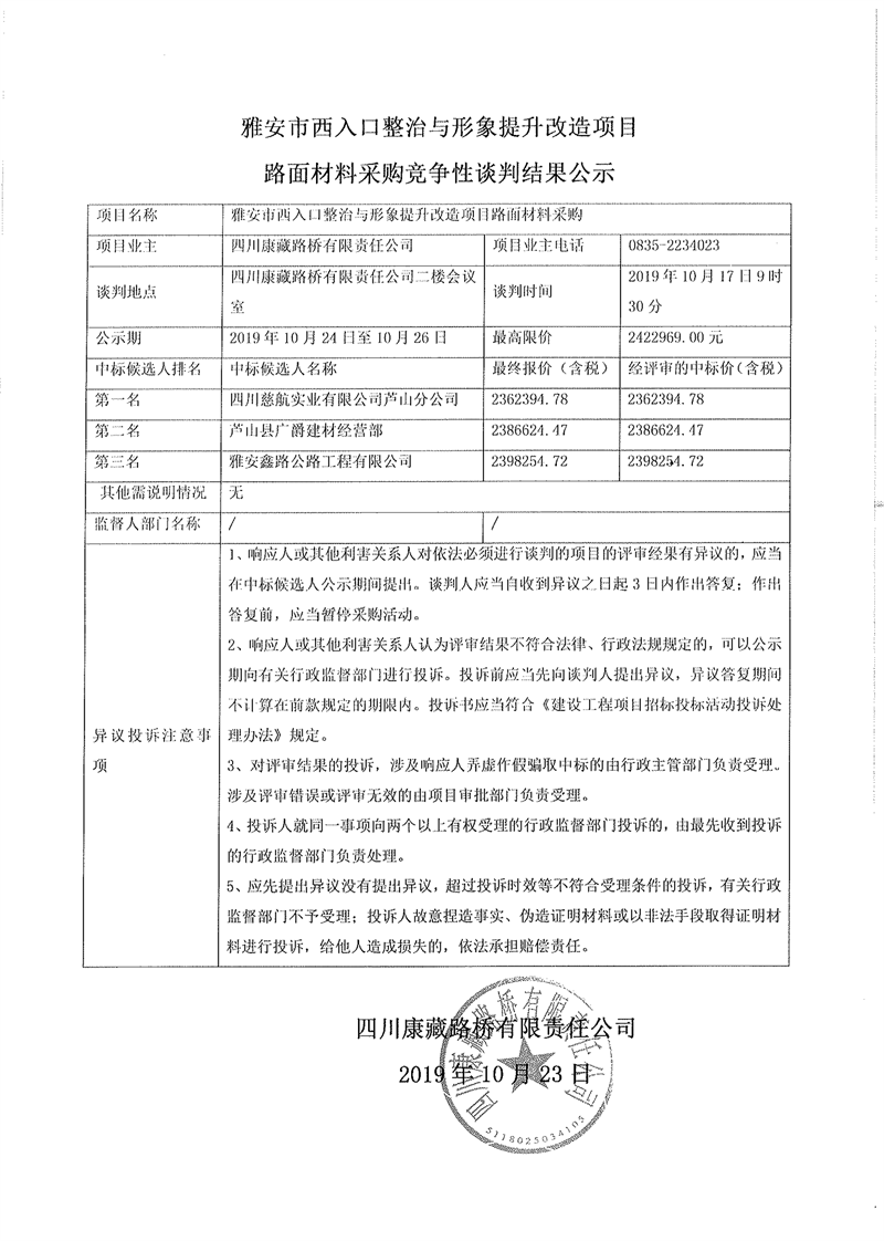 四川康藏路橋有限責任公司雅安市西入口整治與形象提升改造項目路面材料采購競爭性談判結果公示