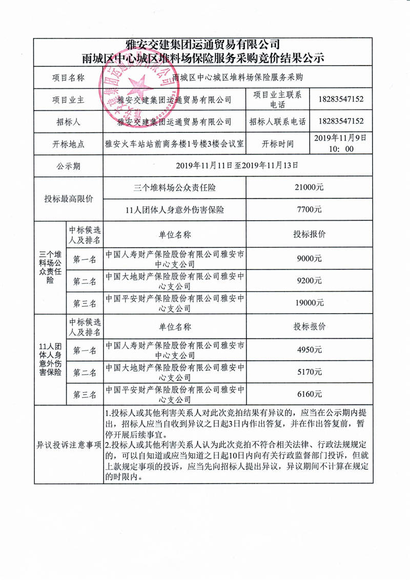 雅安交建集團(tuán)運通貿(mào)易有限公司雨城區(qū)中心城區(qū)堆料場保險服務(wù)采購競價結(jié)果公示