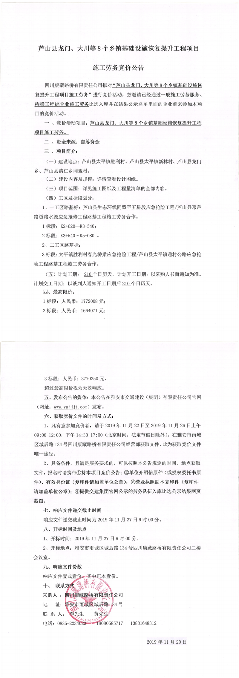 四川康藏路橋有限責(zé)任公司蘆山縣龍門、大川等8個(gè)鄉(xiāng)鎮(zhèn)基礎(chǔ)設(shè)施恢復(fù)提升工程項(xiàng)目施工勞務(wù)競價(jià)公告
