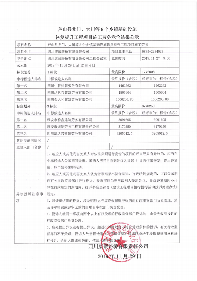 四川康藏路橋有限責任公司蘆山縣龍門、大川等8個鄉(xiāng)鎮(zhèn)基礎設施恢復提升工程項目施工勞務競價結(jié)果公示