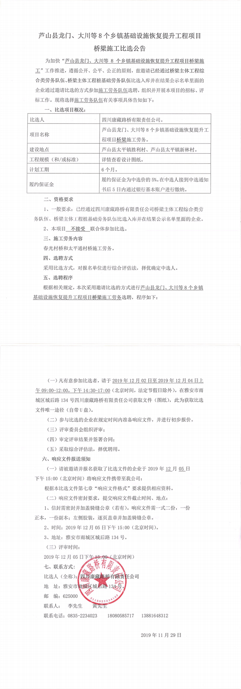 四川康藏路橋有限責任公司蘆山縣龍門、大川等8個鄉(xiāng)鎮(zhèn)基礎設施恢復提升工程項目施工勞務競價結果公示