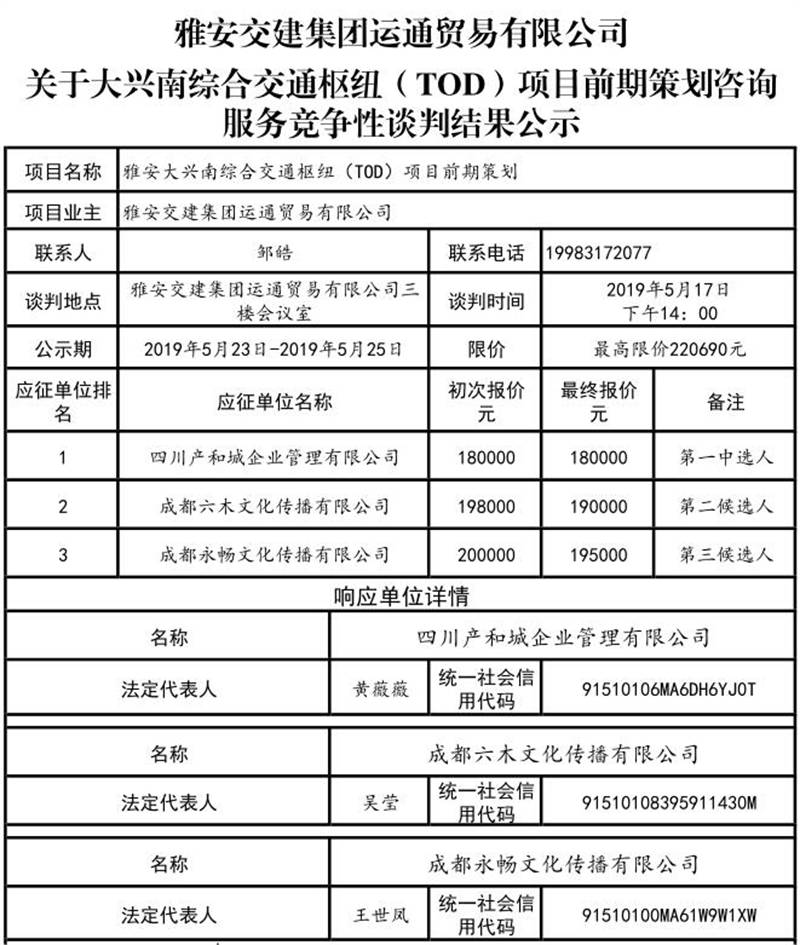 雅安交建集團運通貿(mào)易有限公司關于大興南綜合樞紐(TOD)項目前期策劃咨詢服務競爭性談判結果公司