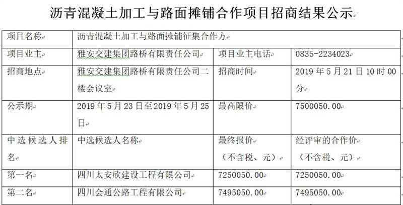 雅安交建集團(tuán)路橋有限責(zé)任公司瀝青混凝土加工與路面攤鋪合作項(xiàng)目招商結(jié)果公告