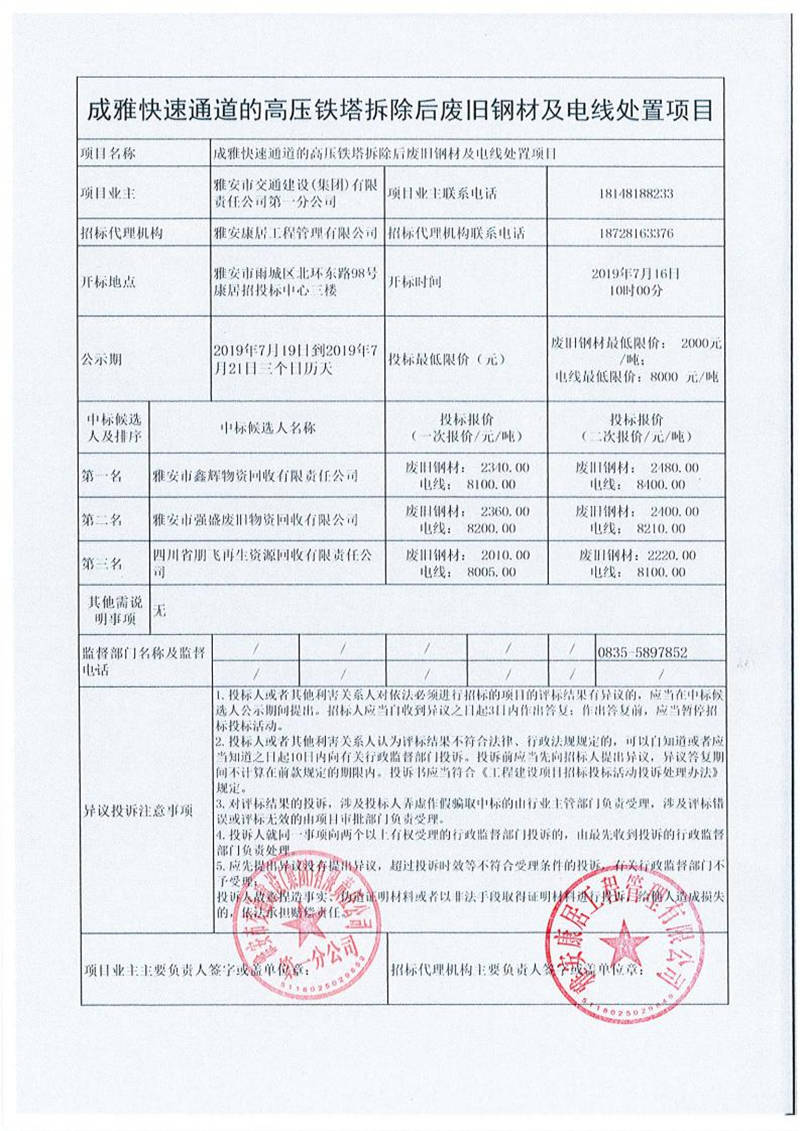 雅安市交通建設(集團)有限責任公司第一分公司成雅快速通道的高壓鐵塔拆除后廢舊鋼材及電線處置項目競價結果公示