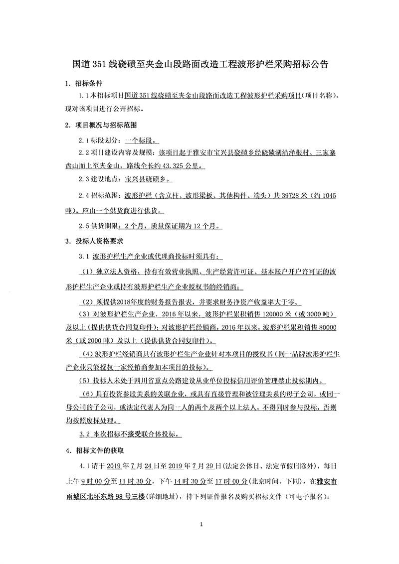 雅安交建集團路橋有限責(zé)任公司國道351線磽磧至夾金山段路面改造工程波形護欄采購招標(biāo)公告