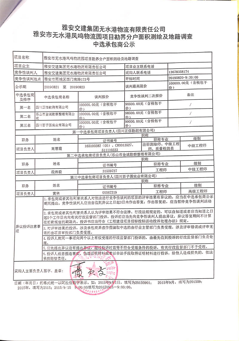 雅安交建集團無水港物流有限責任公司雅安市無水港鳳鳴物流園項目勘界分戶面積測繪及地籍調查中選承包商公示