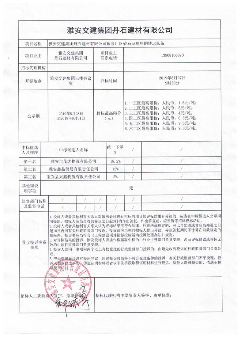 雅安交建集團(tuán)丹石建材有限公司魚泉廠區(qū)砂石及原料的轉(zhuǎn)運隊伍項目競價結(jié)果公示