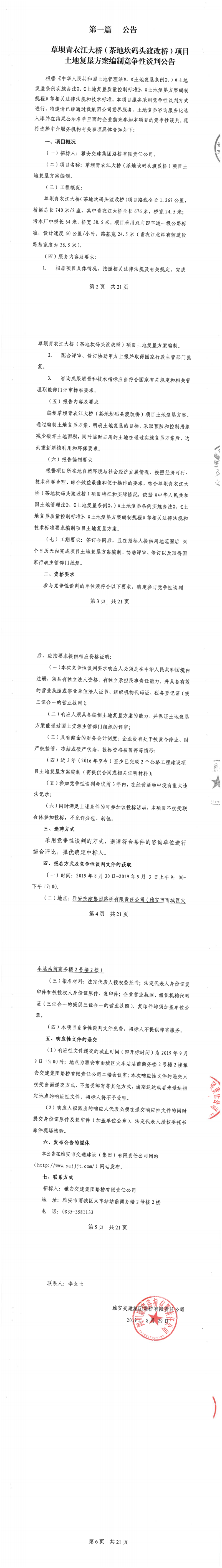雅安交建集團路橋有限責(zé)任公司草壩青衣江大橋(茶地坎碼頭渡改橋)土地復(fù)墾方案編制競爭性談判公告