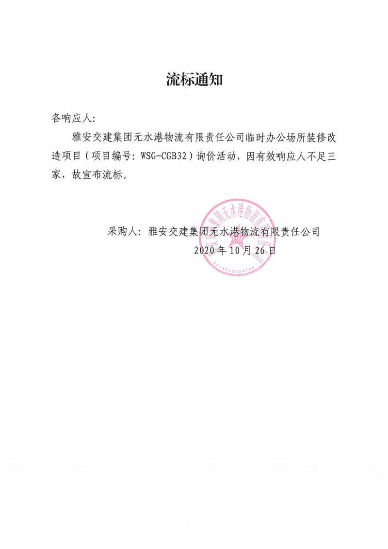 雅安交建集團無水港物流有限責(zé)任公司臨時辦公場所裝修改造項目流標(biāo)通知