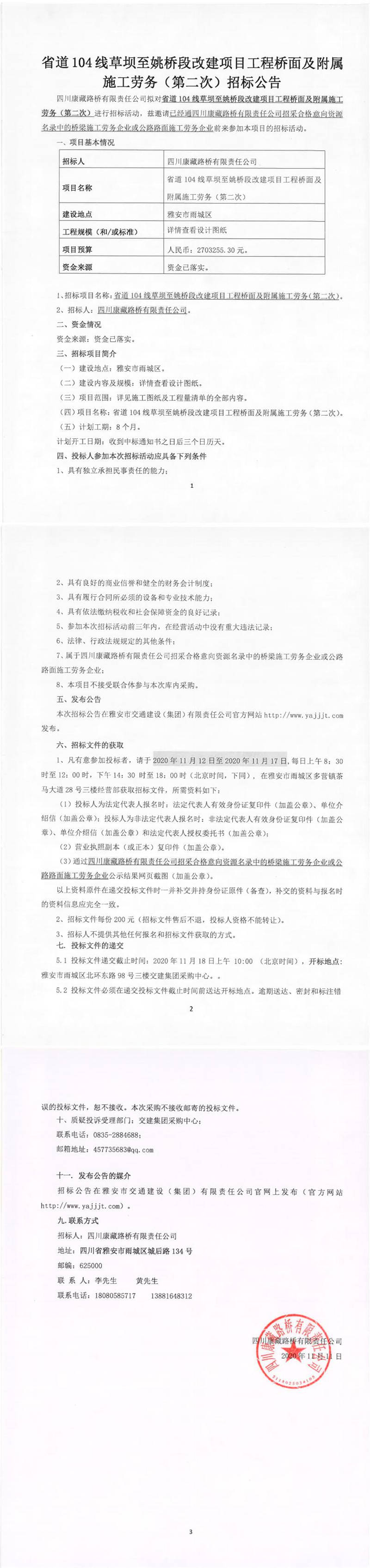 四川康藏路橋有限責(zé)任公司省道104線草壩至姚橋段改建項目工程橋面及附屬施工勞務(wù)(第二次)招標(biāo)公告