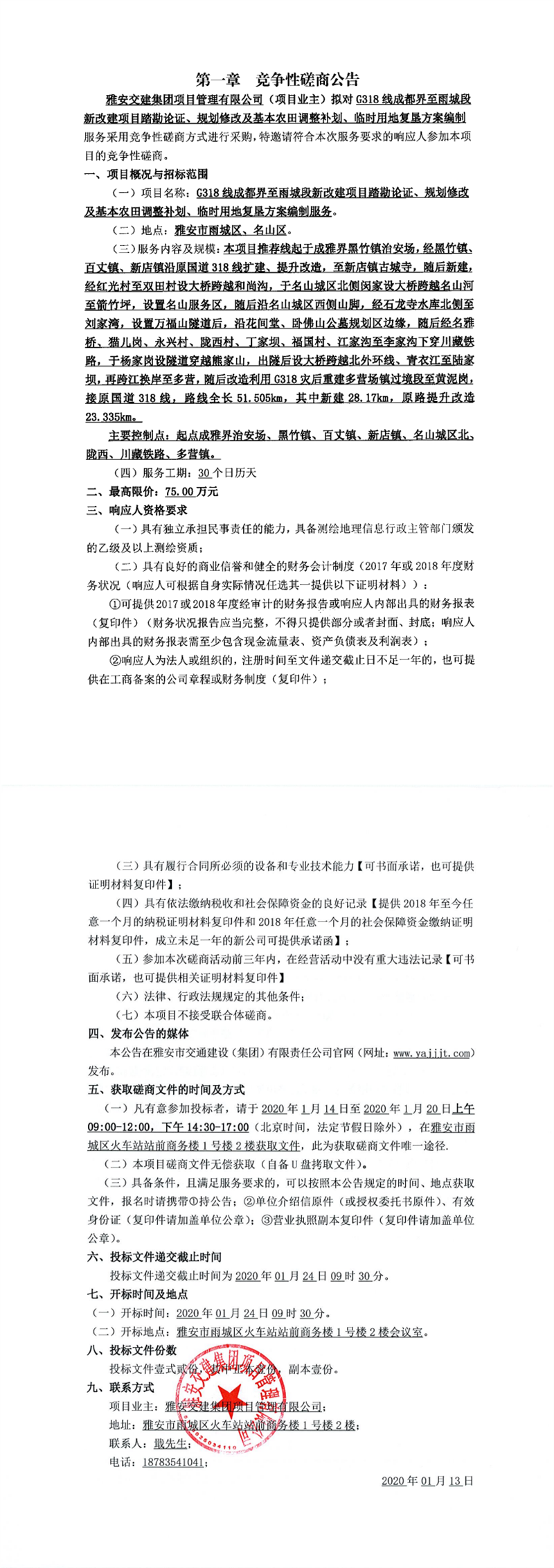 雅安交建集團項目管理有限公司G318線成都界至雨城段新改建項目踏勘論證、規(guī)劃修改及基本農田調整補劃、臨地用地復墾方案編制服務競爭性磋商公告