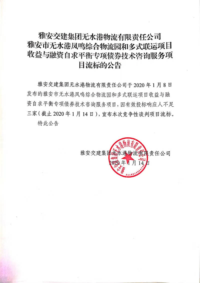 雅安交建集團(tuán)無水港物流有限責(zé)任公司雅安市無水港鳳鳴綜合物流園和多式聯(lián)運(yùn)項(xiàng)目收益與融資自求平衡專項(xiàng)債券技術(shù)咨詢服務(wù)項(xiàng)目流標(biāo)的公告