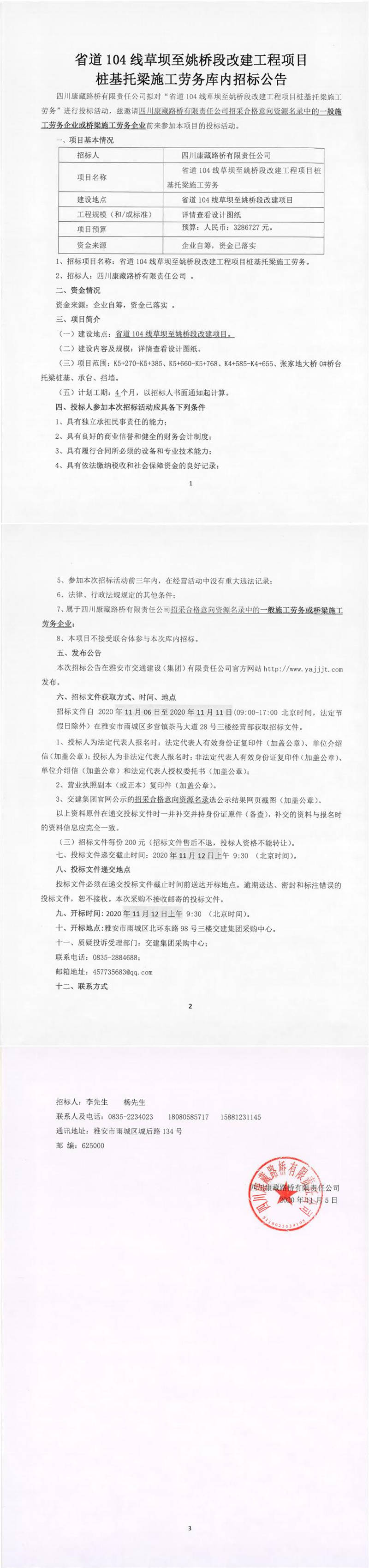 四川康藏路橋有限責(zé)任公司省道104線草壩至姚橋段改建工程項(xiàng)目樁基托梁施工勞務(wù)庫內(nèi)招標(biāo)公告