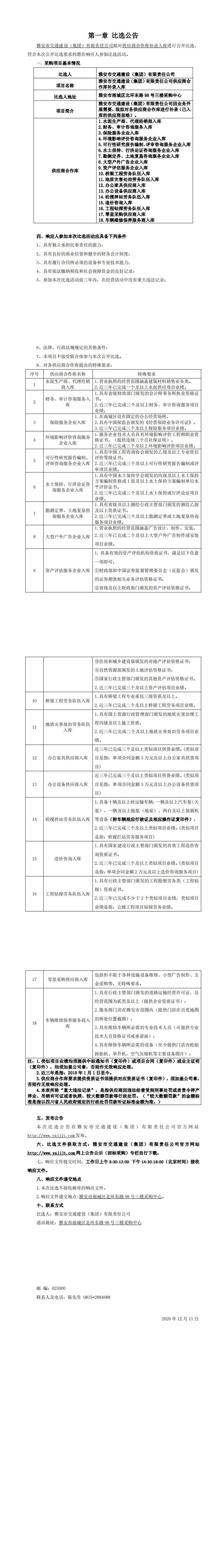 雅安市交通建設(shè)(集團(tuán))有限責(zé)任公司供應(yīng)商合作庫補錄入庫比選公告