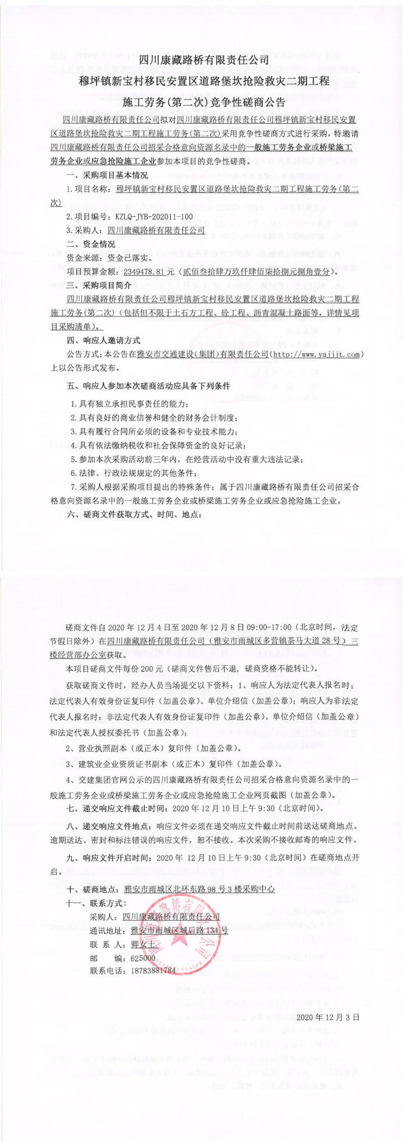 四川康藏路橋有限責(zé)任公司穆坪鎮(zhèn)新寶村移民安置區(qū)道路堡坎搶險(xiǎn)救災(zāi)二期工程施工勞務(wù)(第二次)競(jìng)爭(zhēng)性磋商公告