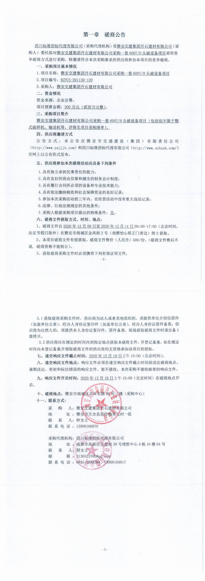 雅安交建集團丹石建材有限公司采購一套600T/H頭破設(shè)備項目磋商公告