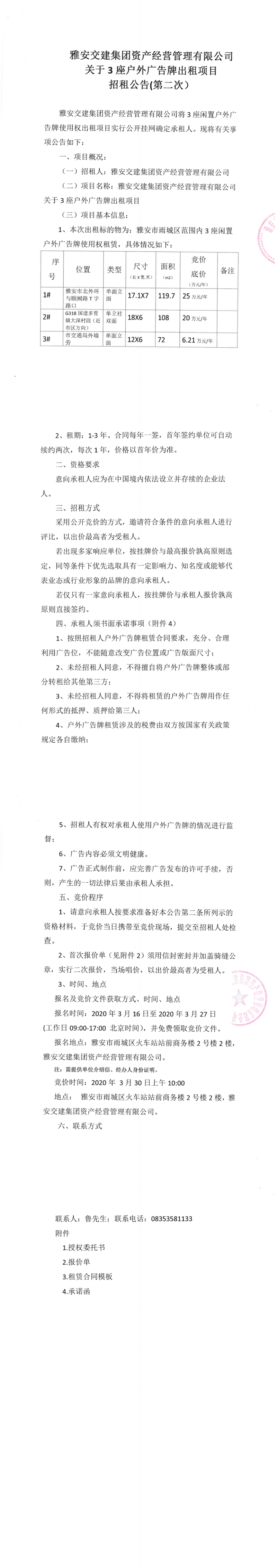 雅安交建集團(tuán)資產(chǎn)經(jīng)營管理有限公司關(guān)于3座戶外廣告牌出租項(xiàng)目招租公告(第二次)