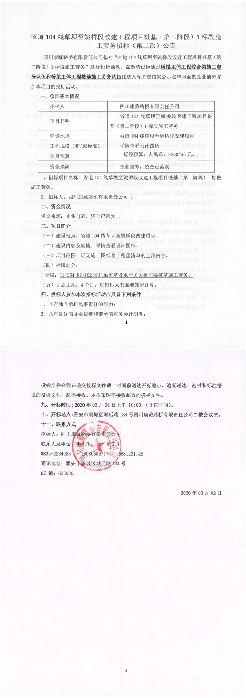 四川康藏路橋有限責(zé)任公司省道104線草壩至姚橋段改建工程項(xiàng)目樁基(第二階段)1標(biāo)段施工勞務(wù)招標(biāo)(第二次)公告