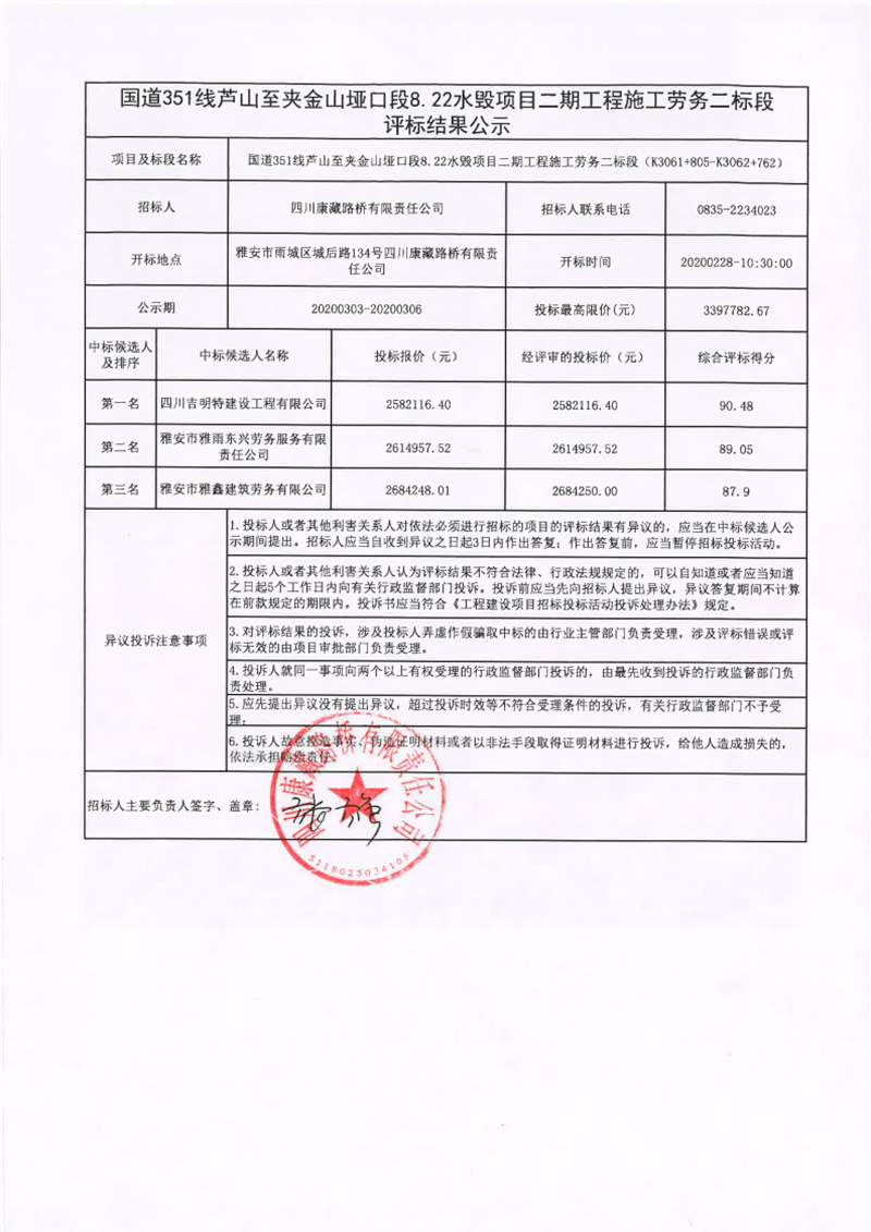 四川康藏路橋有限責(zé)任公司國道351線蘆山至夾金山埡口段8.22水毀項(xiàng)目二期工程施工勞務(wù)二標(biāo)段評標(biāo)結(jié)果公示