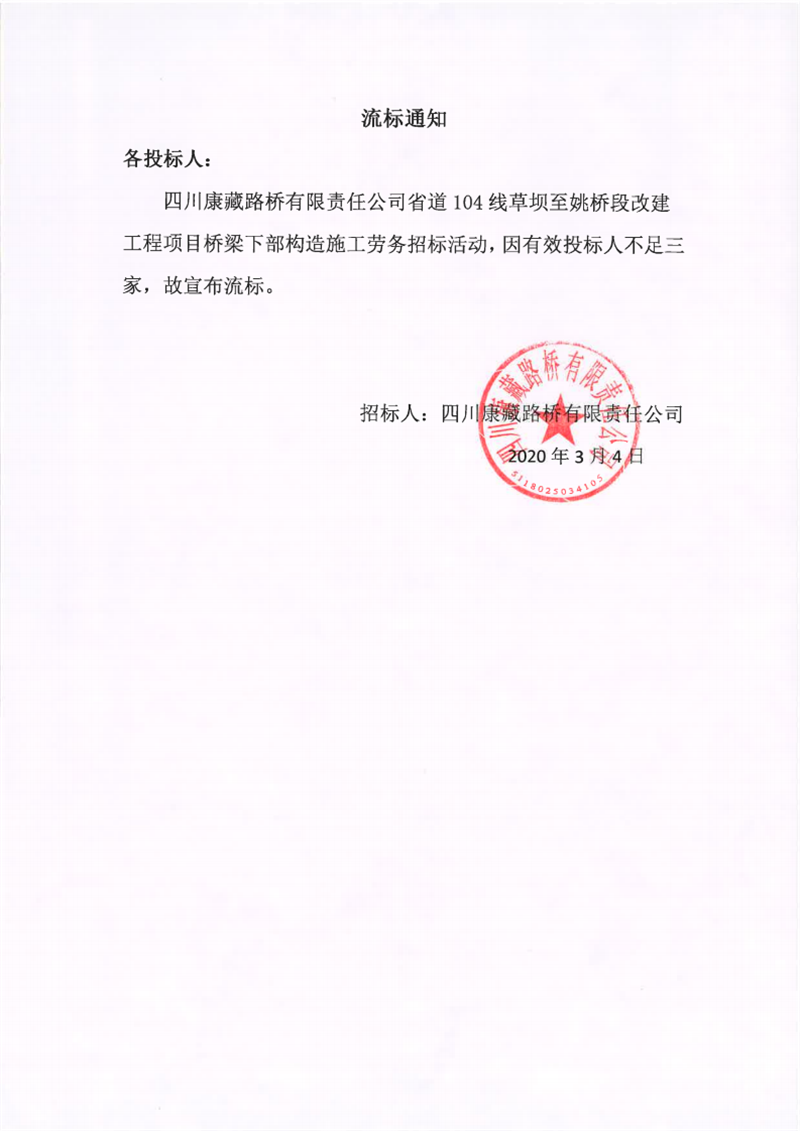 四川康藏路橋有限責任公司省道104線草壩至姚橋段改建工程項目橋梁下部構造施工勞務流標通知
