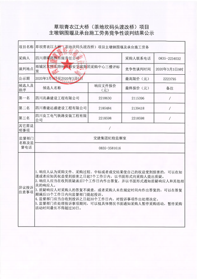 四川康藏路橋有限責任公司草壩青衣江大橋(茶地坎碼頭渡改橋)項目主墩鋼圍堰及承臺施工勞務競爭性談判結果公示