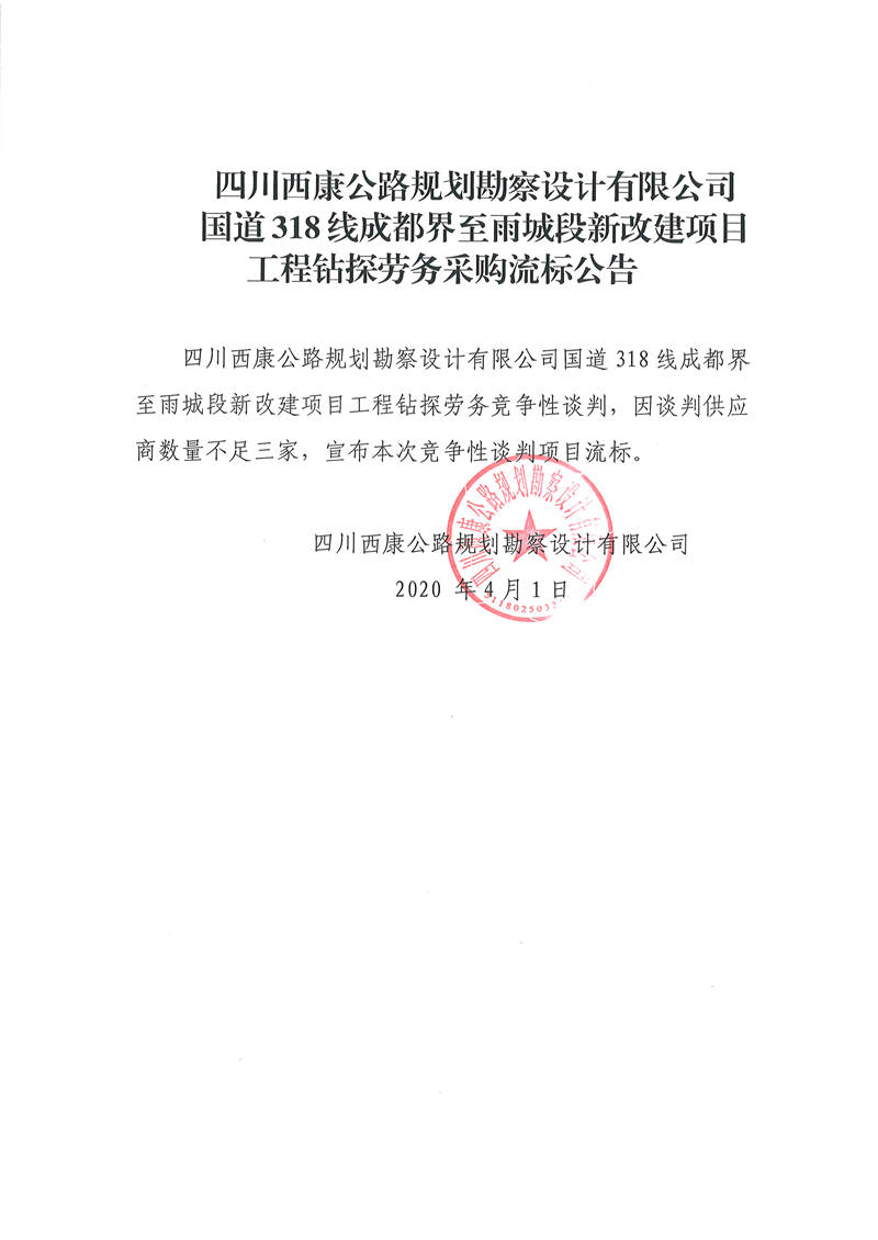 四川西康公路規(guī)劃勘察設(shè)計(jì)有限公司國(guó)道318線成都界至雨城段新改建項(xiàng)目工程鉆探勞務(wù)采購(gòu)流標(biāo)公告