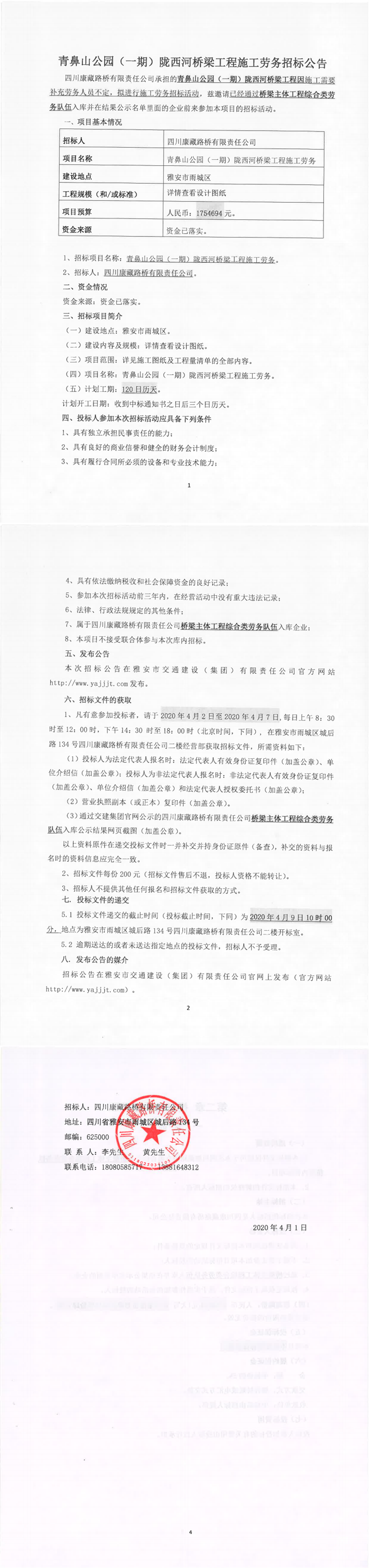 四川康藏路橋有限責任公司青鼻山公園(一期)隴西河橋梁工程施工勞務(wù)招標公告