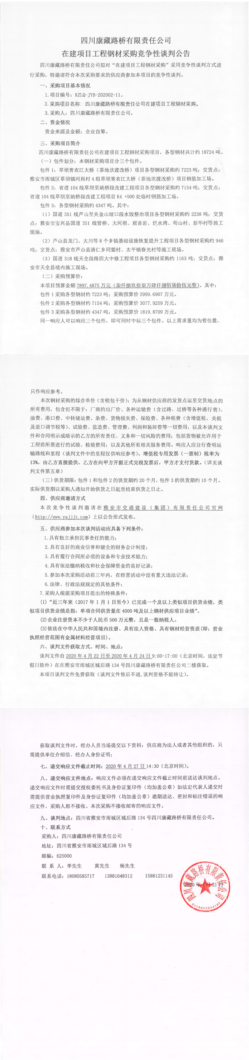 四川康藏路橋有限責(zé)任公司在建項目工程鋼材采購競爭性談判公告