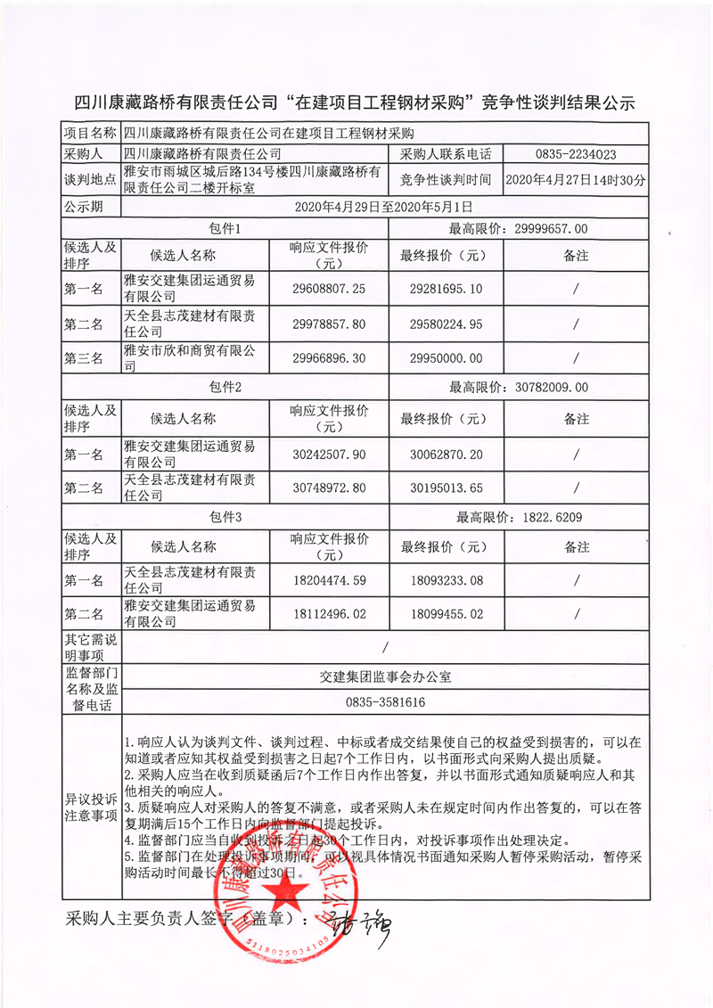 四川康藏路橋有限責(zé)任公司“在建項目工程鋼材采購”競爭性談判結(jié)果公示