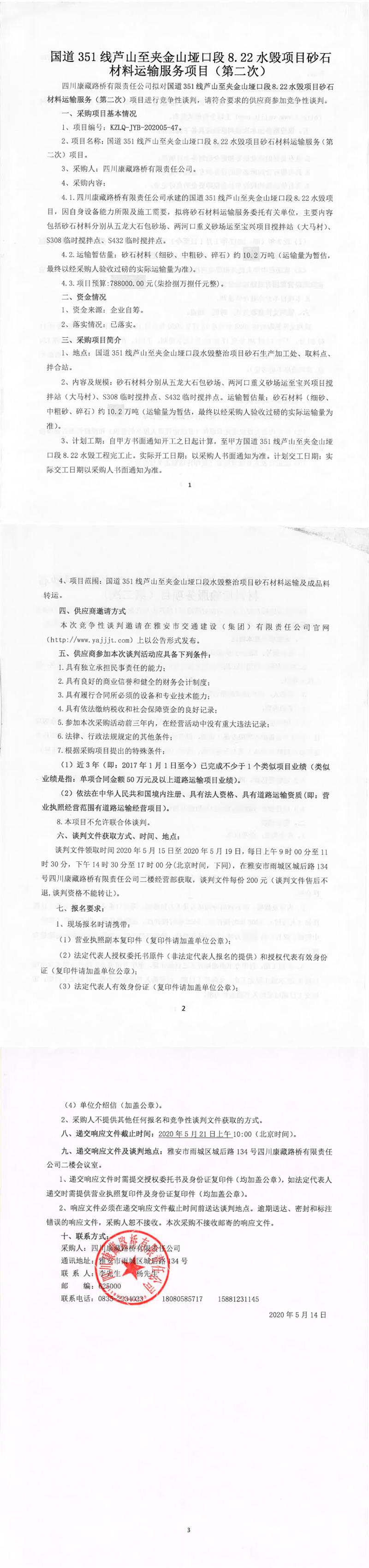 四川康藏路橋有限責(zé)任公司國(guó)道351線蘆山至夾金山埡口段8.22水毀項(xiàng)目砂石材料運(yùn)輸服務(wù)項(xiàng)目(第二次)競(jìng)爭(zhēng)性談判公告