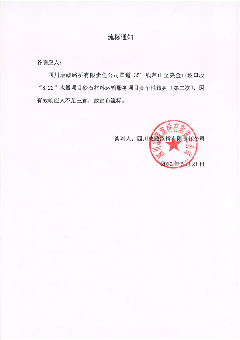 四川康藏路橋有限責(zé)任公司國道351線蘆山至夾金山埡口段8.22水毀項目砂石材料運輸服務(wù)項目(第二次)流標通知