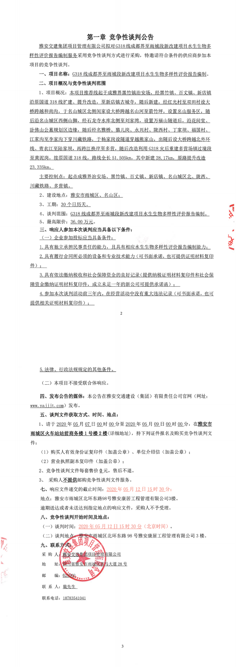 雅安交建集團(tuán)項(xiàng)目管理有限公司G318線成都界至雨城段新改建項(xiàng)目水生生物多樣性評(píng)價(jià)報(bào)告編制競(jìng)爭(zhēng)性談判(第二次)公告