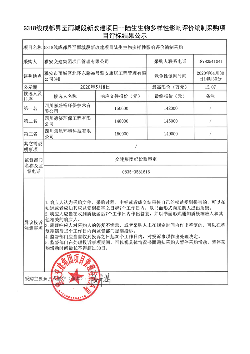 雅安交建集團(tuán)項(xiàng)目管理有限公司G318線(xiàn)成都界至雨城段新改建項(xiàng)目陸生生物多樣性影響評(píng)價(jià)編制采購(gòu)項(xiàng)目評(píng)標(biāo)結(jié)果公示