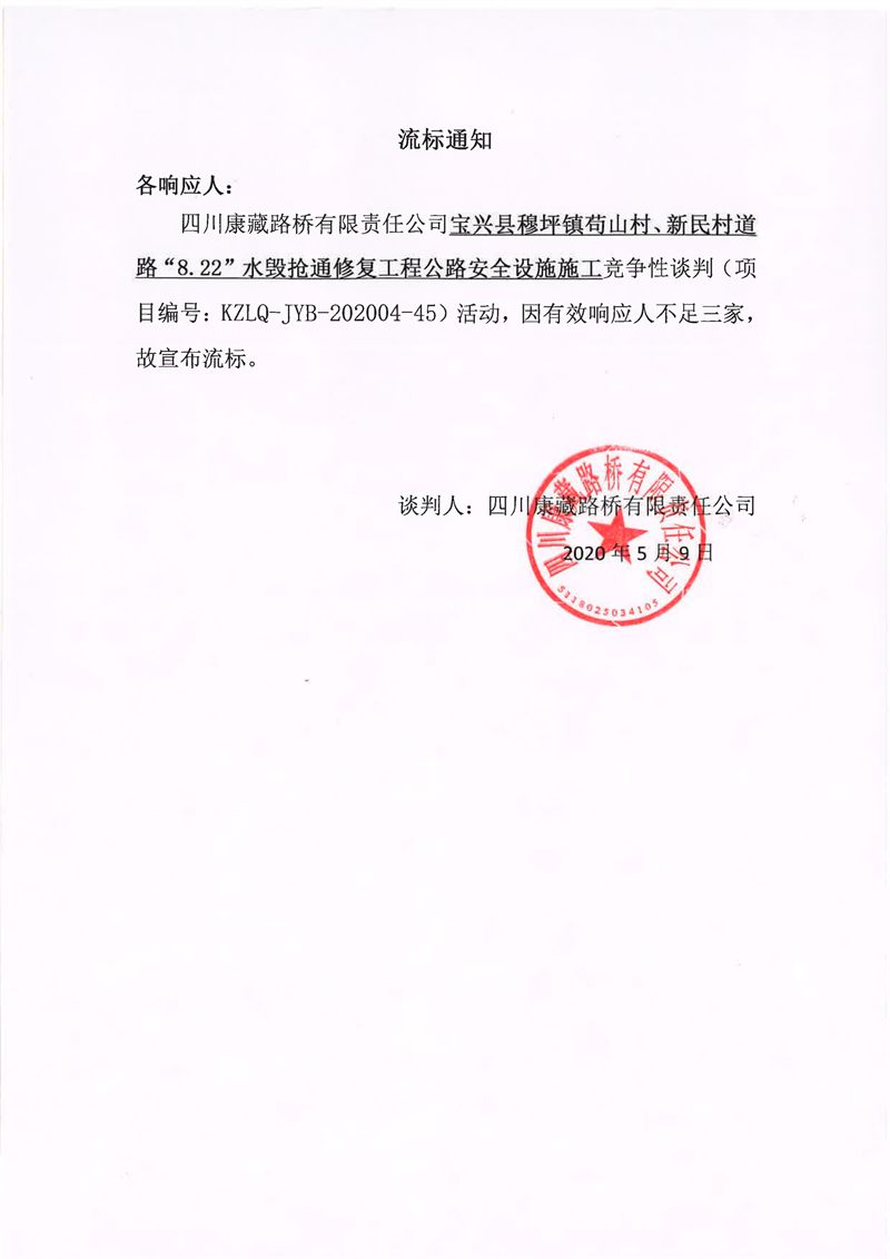 四川康藏路橋有限責(zé)任公司寶興縣穆坪鎮(zhèn)茍山村、新民村道路“8.22”水毀搶通修復(fù)工程公路安全設(shè)施施工競(jìng)爭性談判流標(biāo)通知