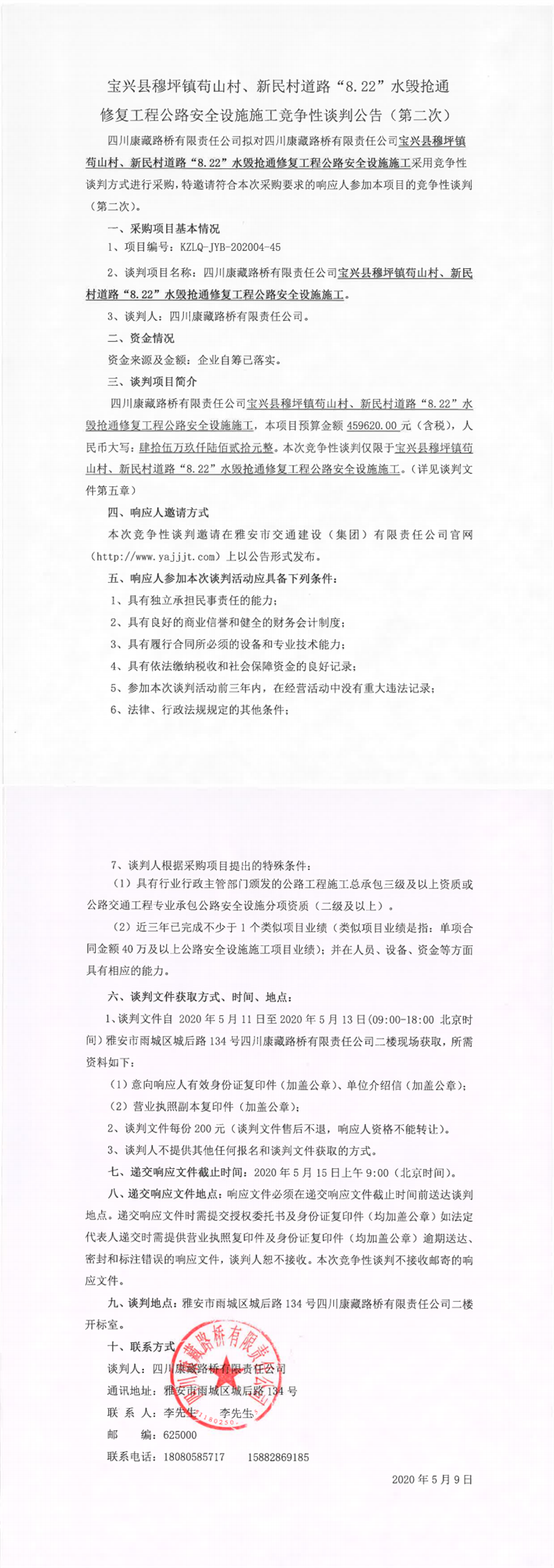 四川康藏路橋有限責任公司寶興縣穆坪鎮(zhèn)茍山村、新民村道路“8.22”水毀搶通修復工程公路安全設施施工競爭性談判公告(第二次)