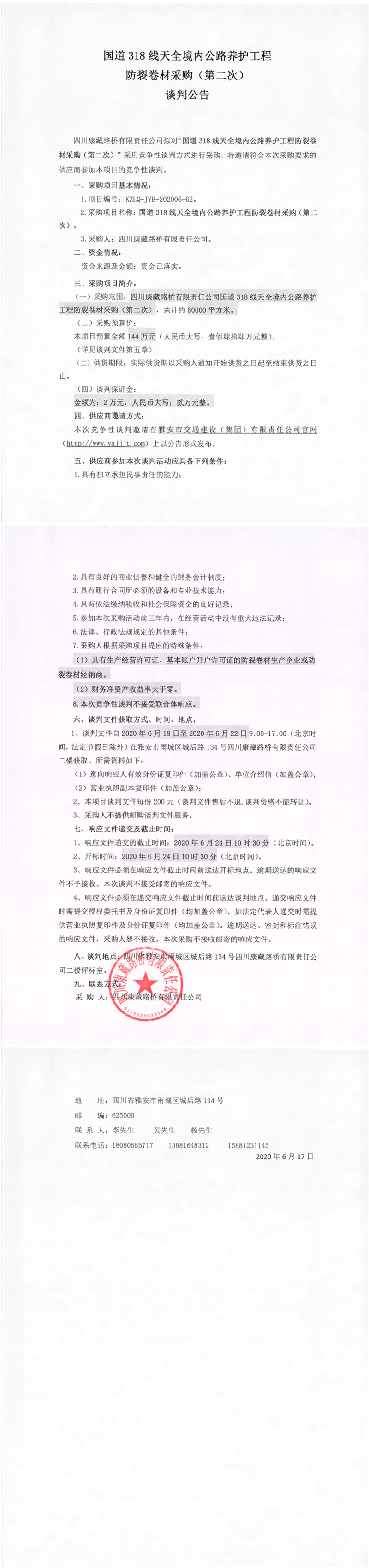四川康藏路橋有限責(zé)任公司國道318線天全境內(nèi)公路養(yǎng)護(hù)工程防裂卷材采購(第二次)談判公告