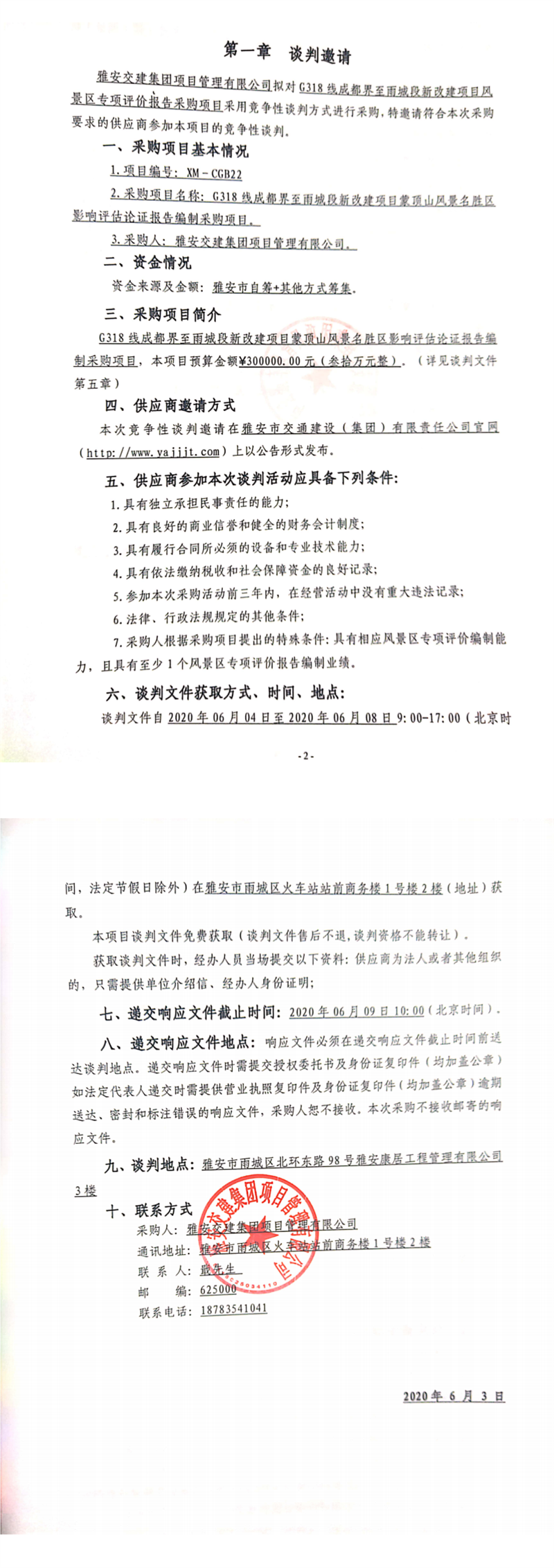 雅安交建集團(tuán)項目管理有限公司G318線成都界至雨城段新改建項目蒙頂山風(fēng)景名勝區(qū)影響評估論證報告編制采購項目競爭性談判公告