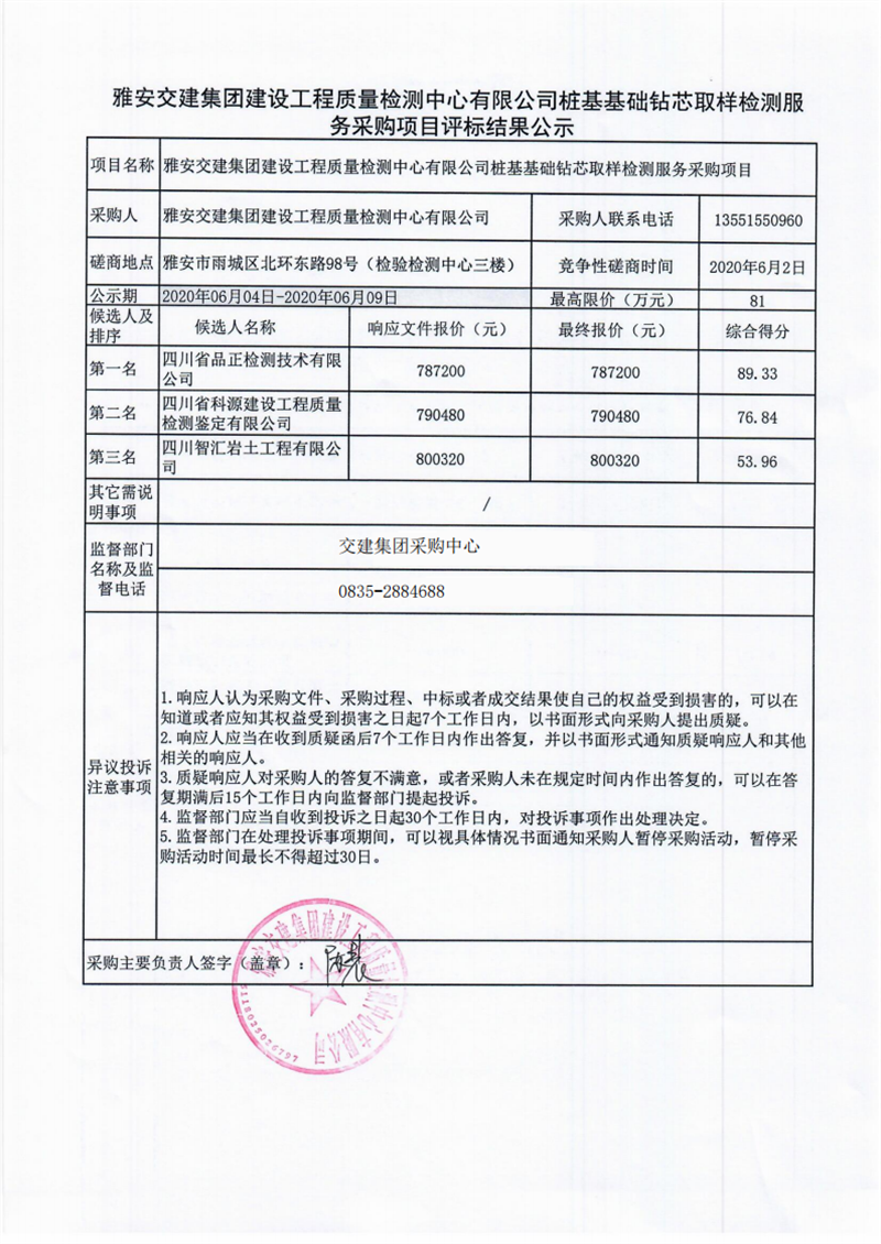 雅安交建集團(tuán)建設(shè)工程質(zhì)量檢測中心有限公司樁基基礎(chǔ)鉆芯取樣檢測服務(wù)采購項(xiàng)目評(píng)標(biāo)結(jié)果公示