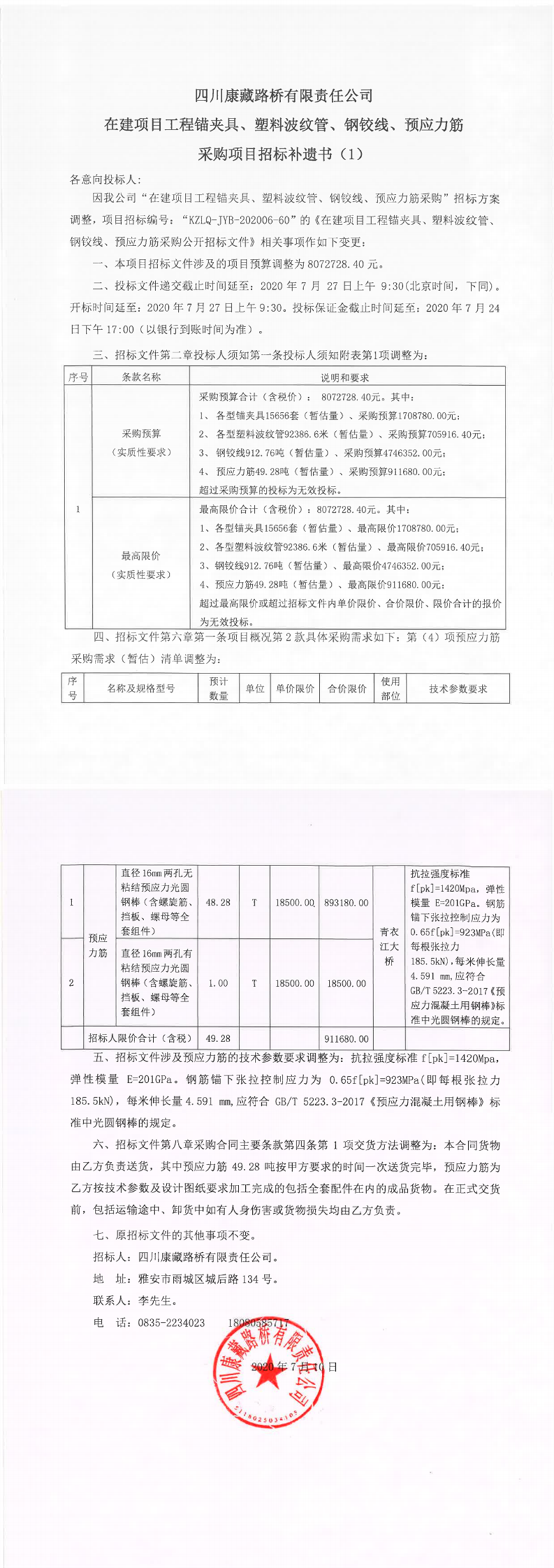 四川康藏路橋有限責(zé)任公司在建項目工程錨夾具、塑料波紋管、鋼鉸線、預(yù)應(yīng)力筋采購項目招標補遺書(1)
