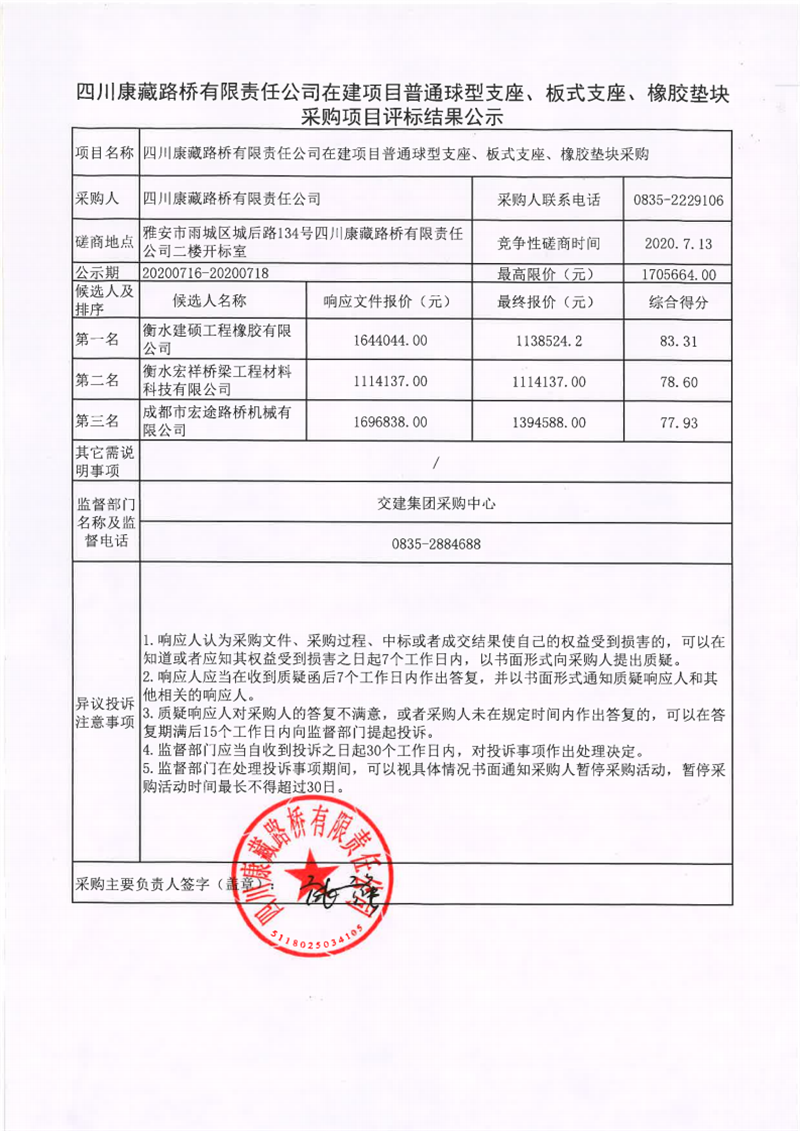 四川康藏路橋有限責任公司在建項目普通球型支座、板式支座、橡膠墊塊采購項目評標結(jié)果公示
