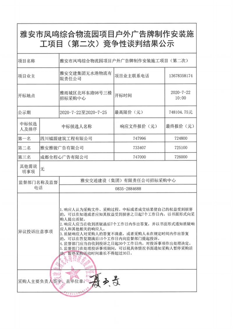 雅安交建集團無水港物流有限責任公司雅安市鳳鳴綜合物流園項目戶外廣告牌制作安裝施工項目(第二次)競爭性談判結(jié)果公示