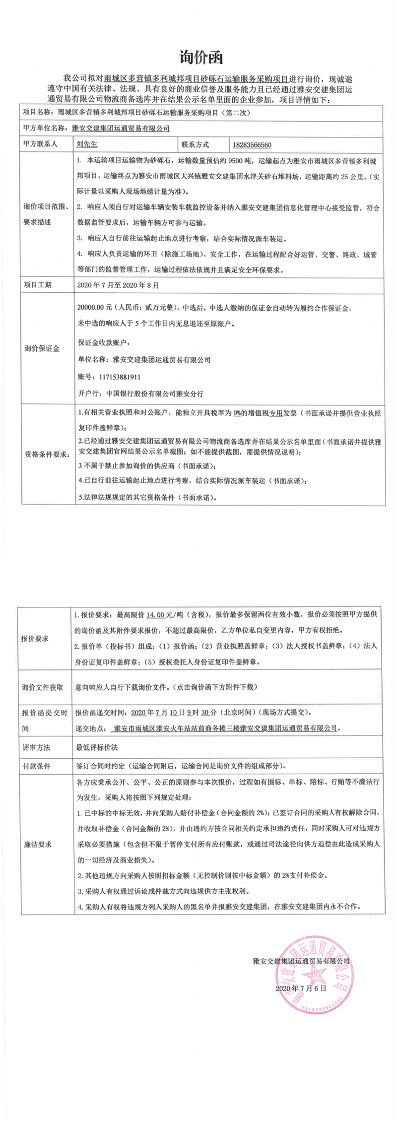 雅安交建集團(tuán)運(yùn)通貿(mào)易有限公司雨城區(qū)多營(yíng)鎮(zhèn)多利城邦項(xiàng)目砂礫石運(yùn)輸服務(wù)采購(gòu)項(xiàng)目(第二次)詢價(jià)函