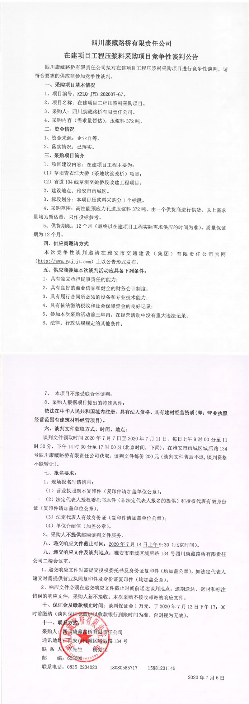 四川康藏路橋有限責任公司在建項目工程壓漿料采購項目競爭性談判公告